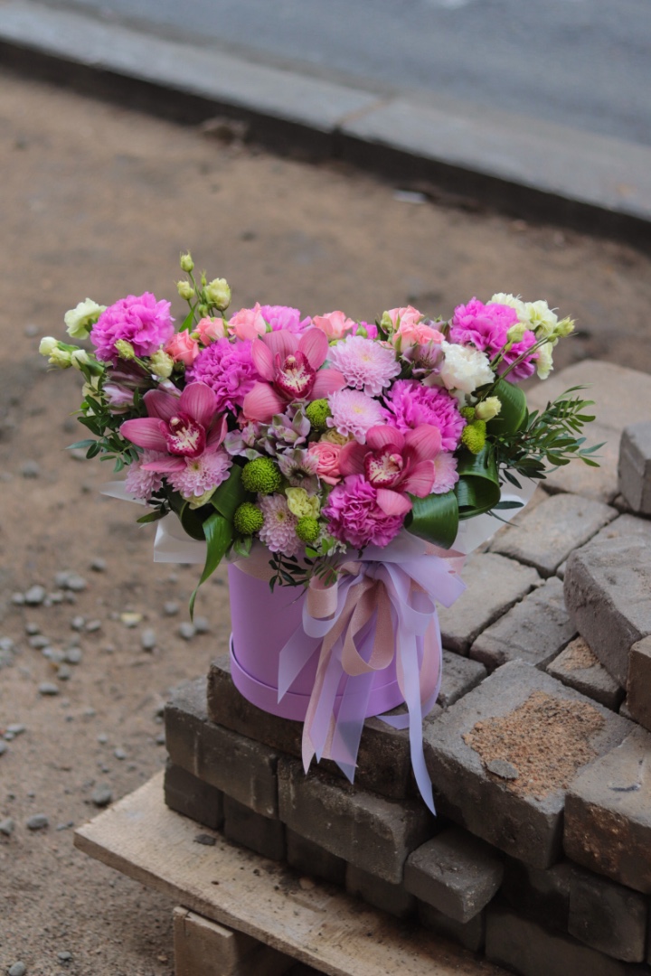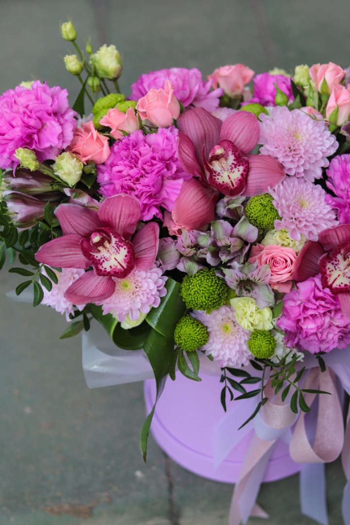 Состав: Альстромерия, Эустома, Аспидистра, Хризантема, гвоздика шабо, Гвоздика, Орхидея Цимбидиум, Роза кустовая